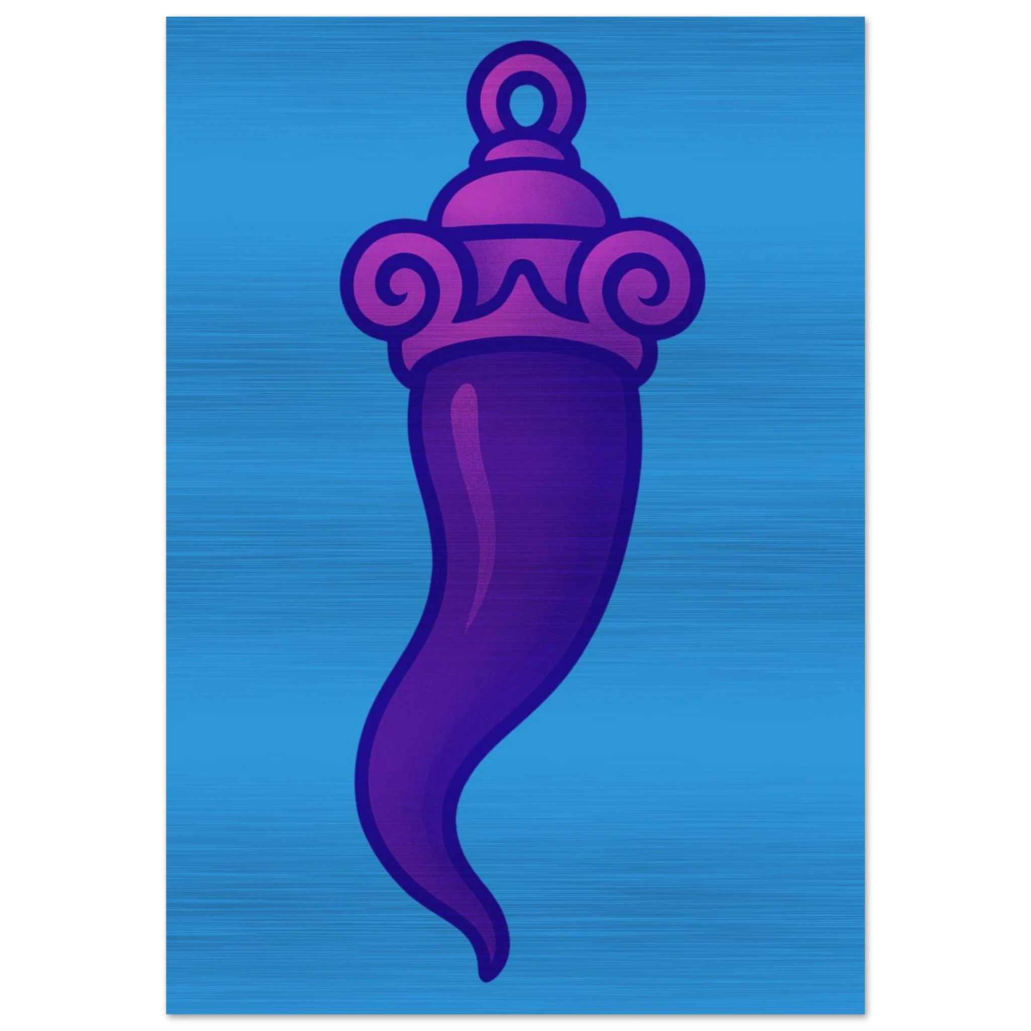 Printed on silver brushed aluminum for a textured, industrial look. The colors interact with the metallic surface, creating a unique artistic effect.