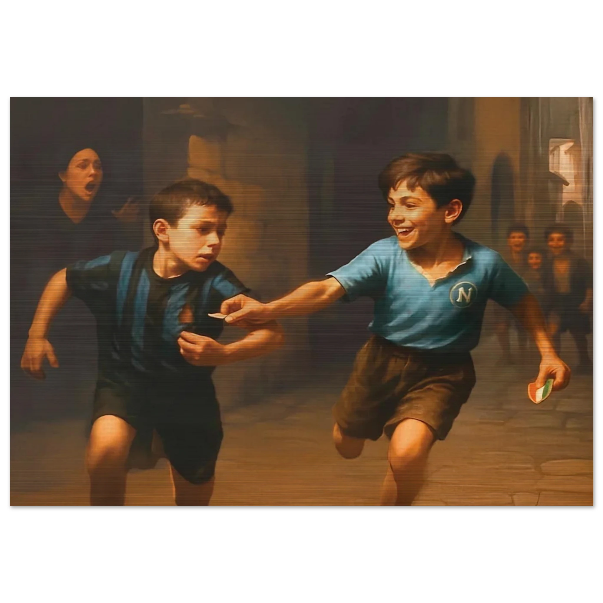 Stampato su alluminio spazzolato color argento per un aspetto testurizzato e industriale. I colori interagiscono con la superficie metallica creando un effetto artistico unico.